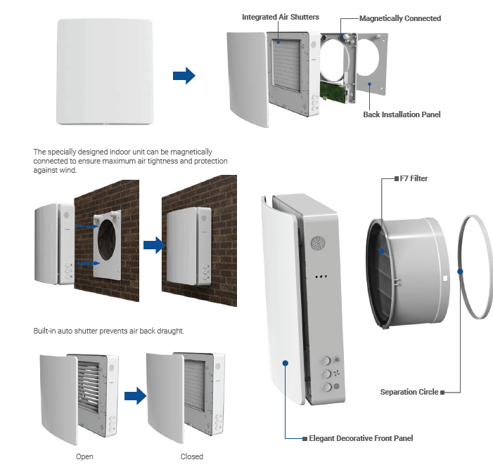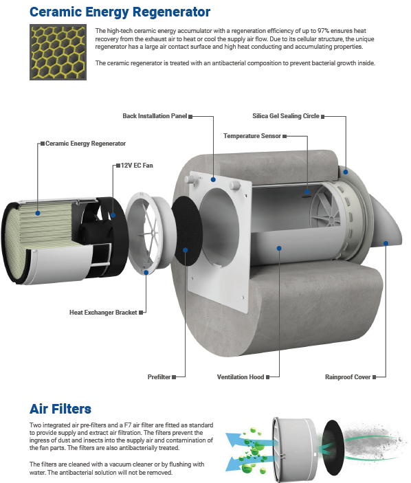 Asigura aport de aer proaspat si evacuarea aerului viciat, recuperand caldura prin intermediul unui schimbator ceramic. Functionarea este reversibila, cu flux alternativ de aer, ceea ce permite mentinerea temperaturii interioare si reducerea pierderilor de energie.