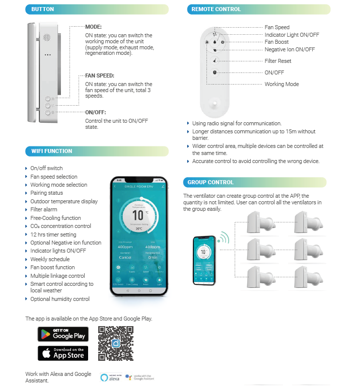 Recuperator de caldura cu senzor de umiditate si control WiFi, flux de aer reversibil, schimbator ceramic